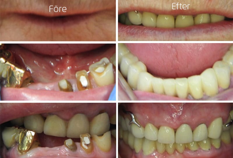 Allmänt: 51 årig kvinna med eftersatt tandhälsa. Är missnöjd med nuvarande utseénde och har dessutom tuggsvårigheter. Önskar få nya fasta tänder med kvalitét. Diagnoser: tandlöshet, generell tandlossning, karies, m.fl. Utförd terapi: utdragning av alla tänder i både över- och underkäken, och sedan implantat i hela munnen. Utförd av: tandläkare Hanne Sliwo (våren 2014)