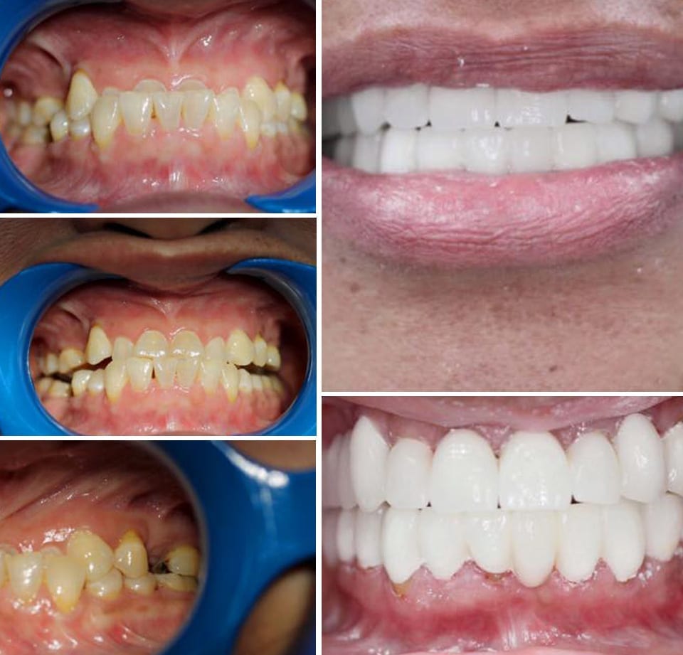 Allmänt: Medelålders kvinna som länge velat ha ett snyggare leende. Hennes framtänder var triangulära i formen och hade lagats väldigt många gånger. Patienten önskade även att få en glugg mellan framtänderna. Utförd behandling: efter att porslinskronor gjorts på framtänderna blev patienten nöjd och känner sig säker med sitt leende igen. Utfört av tandläkare Kevin Mohseni, Skogås.