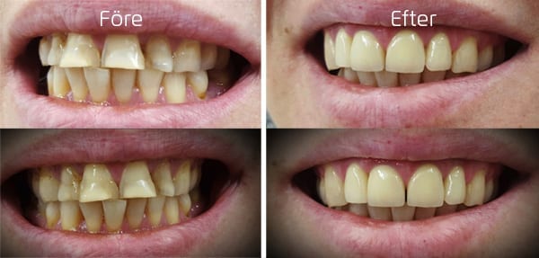 Medelålders kvinna som önskar få finare leende. Diagnos: Tänderna i överkäken är glesställda och ojämna. Utförd behandling: De sex framtänderna (hörntand-hörntand) bekläds med tunna fasader av porslin. Notera harmonin så erhålls efter lite justering färg, form och storlek på de nya tänderna. Behandlare: Hanne Sliwo, tdl