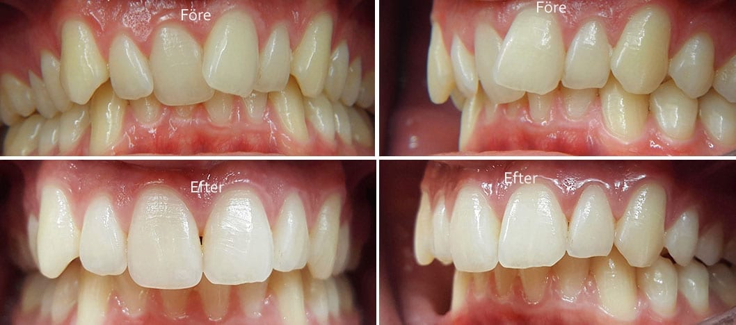 Fall: 21 årig man kommer på konsultation. Stör sig på sina framtänder i överkäken.Vill gärna ha rakare och mer symmetriska tänder i överkäken. Detta fall har behandlats med den avtagbara tandställningen Inman Aligner för överkäken på några månader.